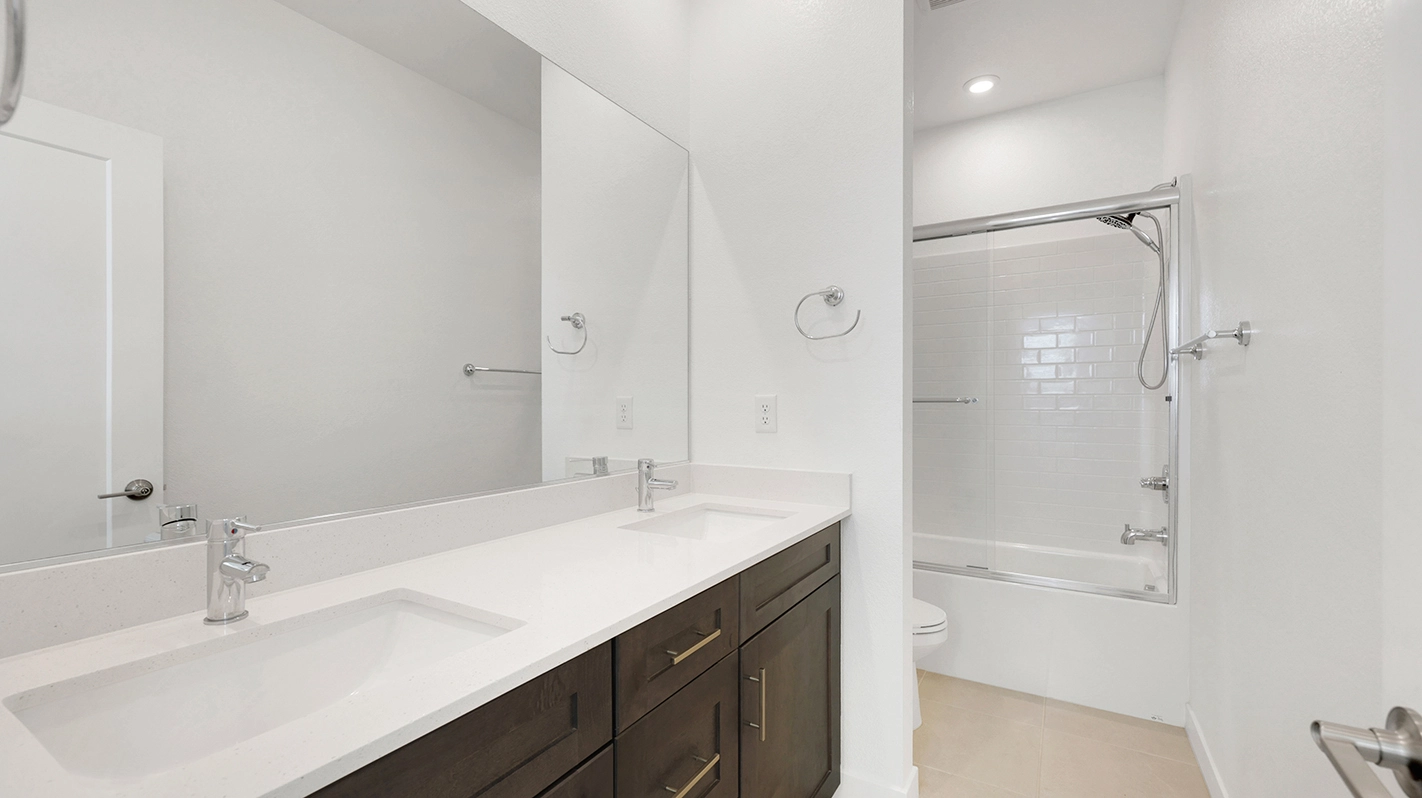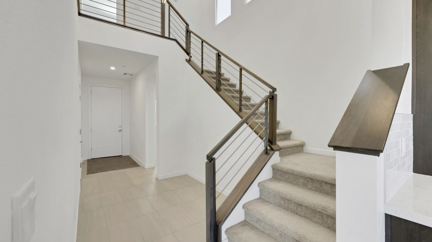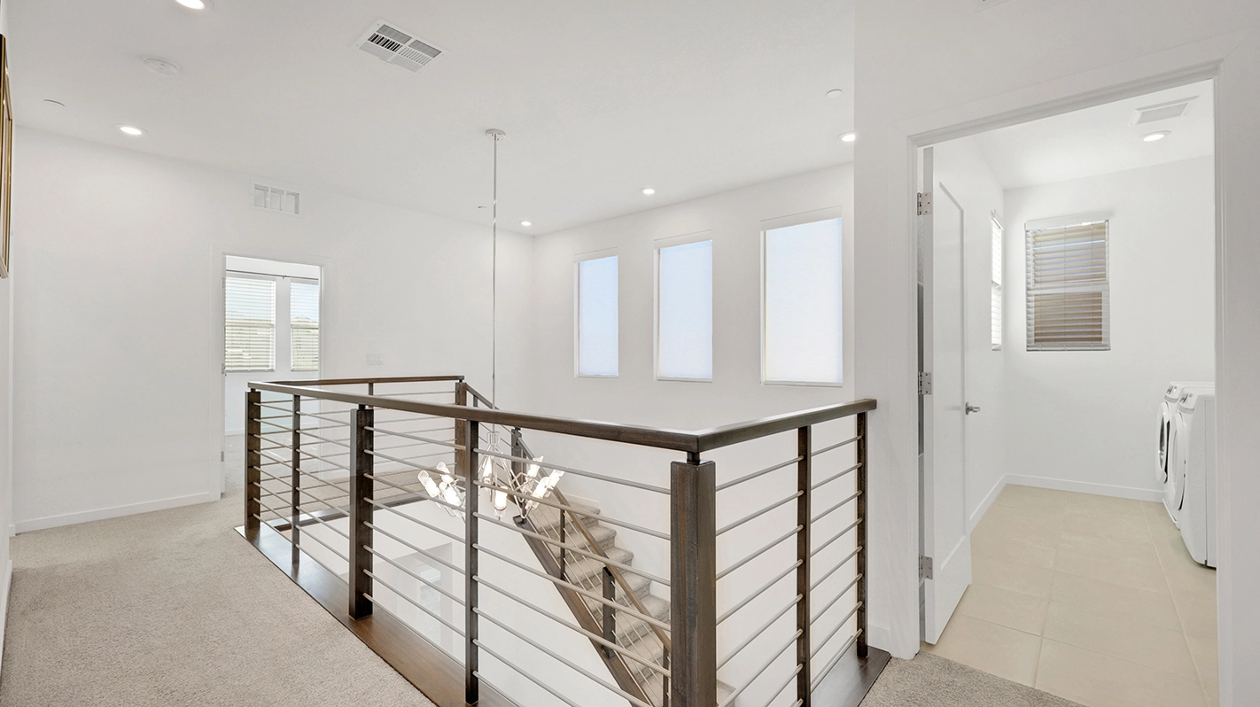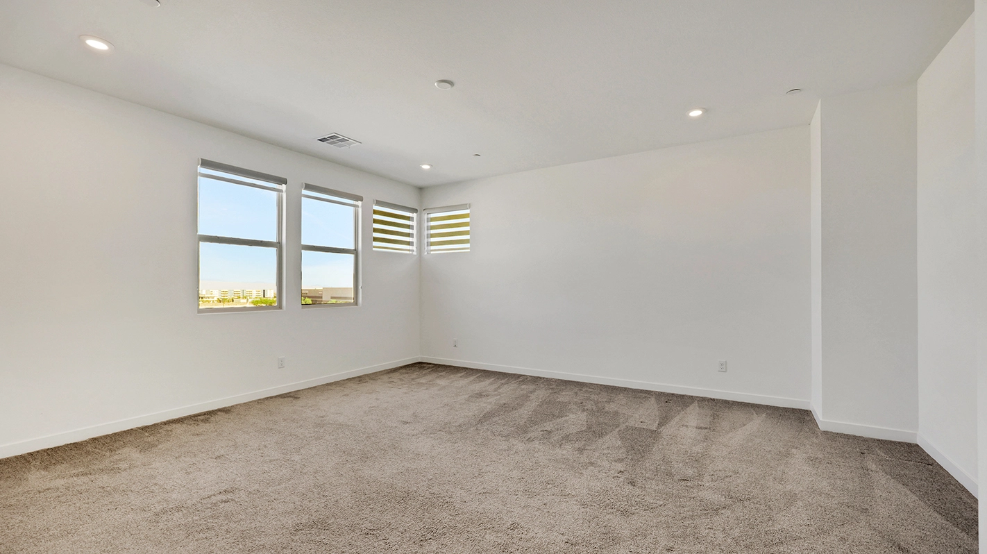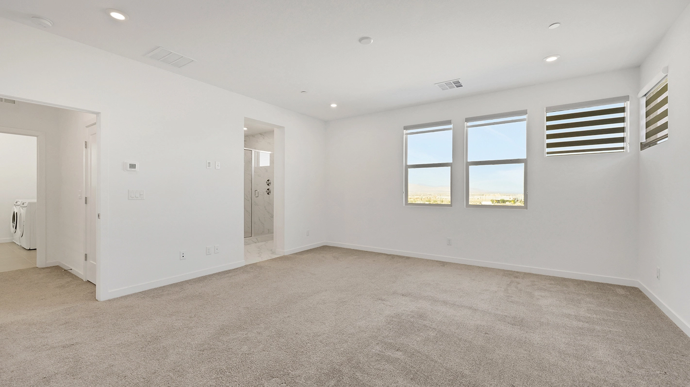 The elegant upstairs primary suite includes dual vanities, a walk-in closet, and a spacious shower designed for two. Two additional bedrooms, plus an upstairs laundry room with shelving, keep daily life organized. Located in the Inspirada community with access to parks, pools, trails, courts, and community events.