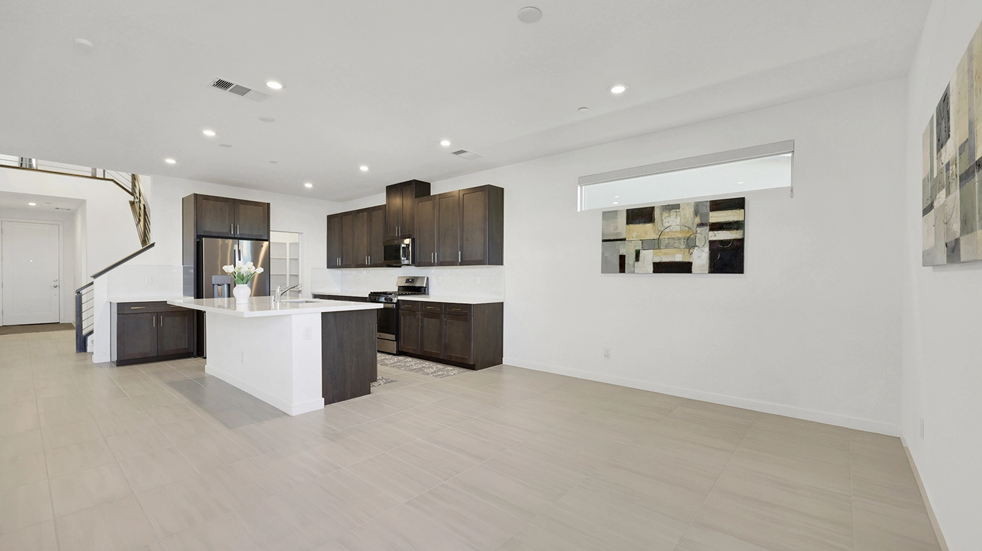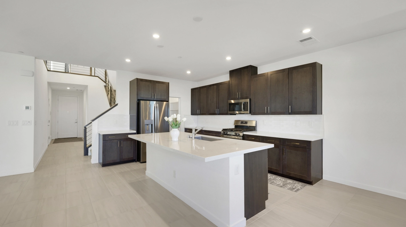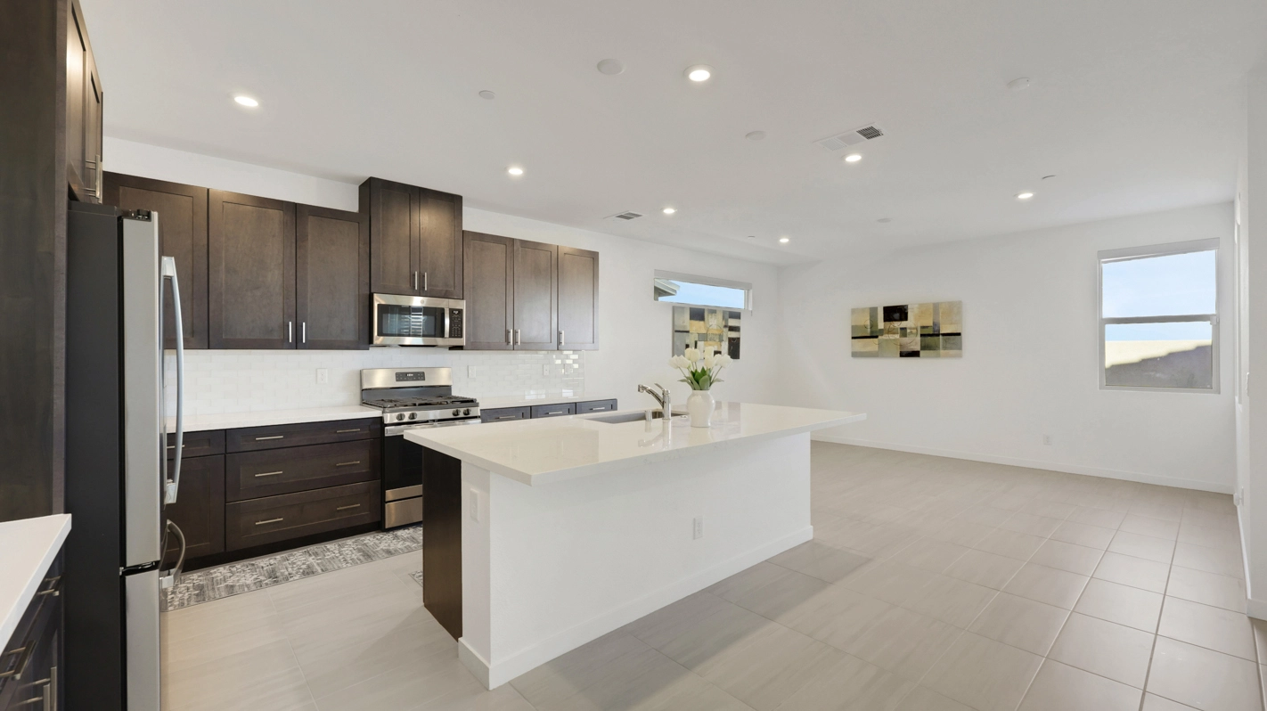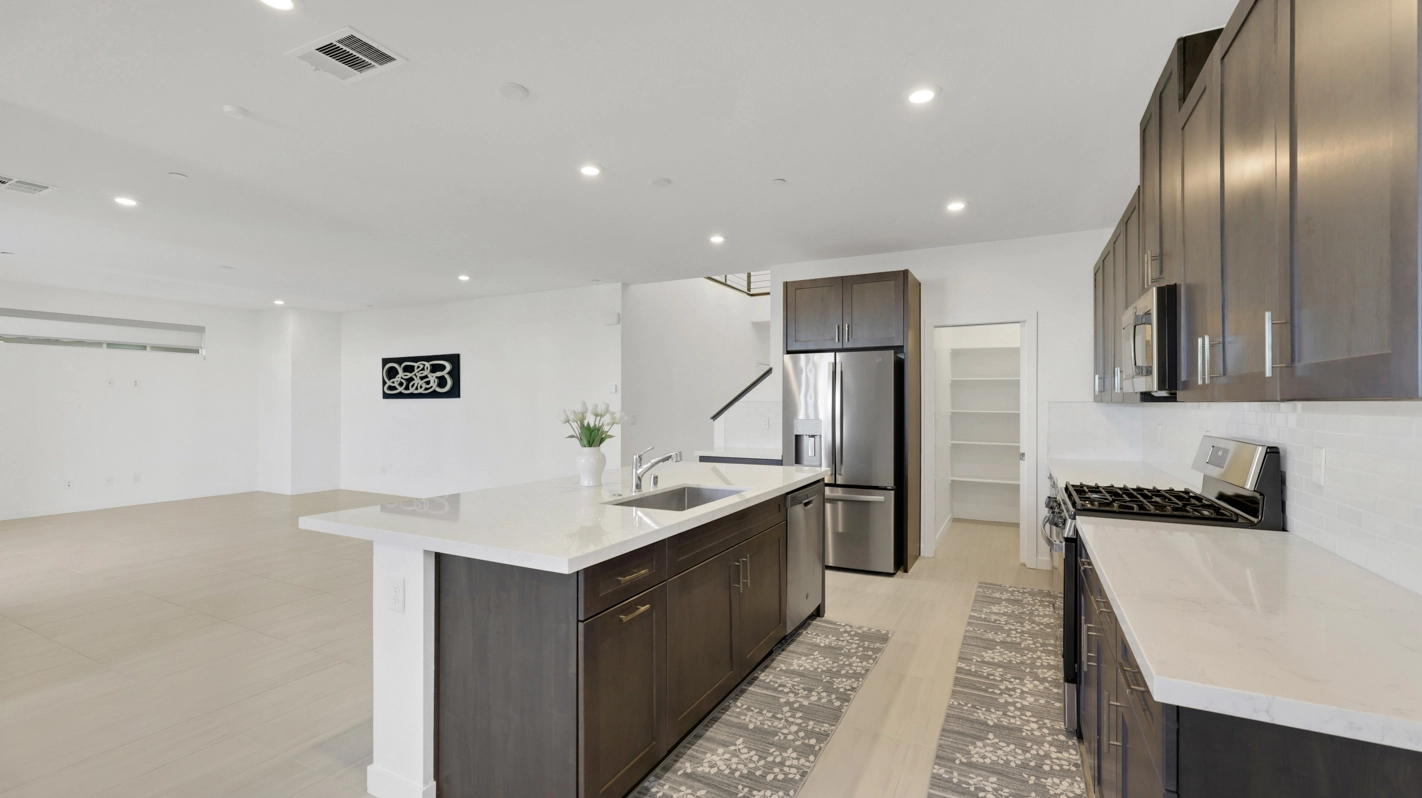 Welcome to a bright, move-in ready Inspirada home with a modern open concept, luxury vinyl plank flooring throughout, and a chef’s kitchen featuring stainless steel appliances, quartz countertops, a large island breakfast bar, recessed lighting, and a true walk-in pantry.